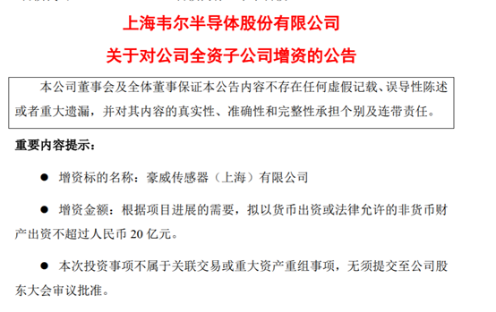 8月17日晚間,韋爾股份發(fā)布關(guān)于對公司全資子公司增資的公告,稱擬對全資子公司豪威傳感器(上海)有限公司(以下簡稱“豪威傳感器”)增資不超過人民幣20億元,擬用于在中國(上海)自由貿(mào)易試驗(yàn)區(qū)臨港新片區(qū)購置土地設(shè)立臨港基地,以在未來履行公司上海研發(fā)總部及離岸貿(mào)易中心兩項(xiàng)職能。