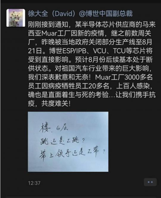日前,博世中國執(zhí)行副總裁徐大全在朋友圈發(fā)文,“剛剛接到通知,某半導(dǎo)體芯片供應(yīng)商的馬來西亞Muar工廠因新的疫情,繼之前數(shù)周關(guān)廠,昨晚被當(dāng)?shù)卣P(guān)閉部分生產(chǎn)線至8月21日。博世ESP/IPB、VCU、TCU等芯片將受到直接影響,預(yù)計8月份后續(xù)基本處于斷供狀態(tài)。對祖國汽車行業(yè)帶來的巨大影響,我們深表歉意和無奈!”