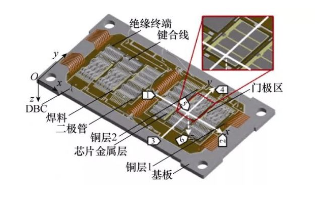 功率模塊在新能源汽車(chē)動(dòng)力總成系統(tǒng)中應(yīng)用廣泛。高功率密度和高集成化趨勢(shì)加劇了芯片表面溫度梯度,而元胞電學(xué)參數(shù)具有溫變效應(yīng),導(dǎo)致芯片形成電流密度不均勻分布特征。因汽車(chē)低速大轉(zhuǎn)矩、重載定子堵轉(zhuǎn)、起步加速等極端工況下半導(dǎo)體芯片過(guò)電流運(yùn)行,元胞電流分配不均更加嚴(yán)重,片上溫度場(chǎng)形成機(jī)制尚不明確,為功率模塊安全運(yùn)行帶來(lái)隱患。因此,對(duì)功率模塊片上電致溫度場(chǎng)的建模與分析尤為迫切。