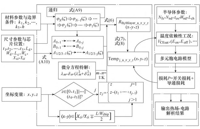 為了實(shí)現(xiàn)對(duì)芯片溫度的準(zhǔn)確預(yù)測(cè),國(guó)內(nèi)外學(xué)者主要采用有限元法,依賴(lài)ANSYS等國(guó)外商用軟件。然而:有限元軟件對(duì)電特性的求解采用歐姆定律,無(wú)法應(yīng)對(duì)電流連續(xù)變化下的芯片電特性表征,導(dǎo)致芯片電致溫度場(chǎng)預(yù)測(cè)的準(zhǔn)確性存在較大誤差;有限元法需要求解離散微元的偏微分方程,計(jì)算量大,求解時(shí)間長(zhǎng),導(dǎo)致難以適用于功率半導(dǎo)體器件溫度的動(dòng)態(tài)在線預(yù)測(cè)與健康狀態(tài)管理;有限元法在求解高溫變效應(yīng)的芯片電熱耦合問(wèn)題時(shí)易不收斂,限制了其在碳化硅基等新一代寬禁帶半導(dǎo)體功率器件電熱耦合研究中的應(yīng)用。