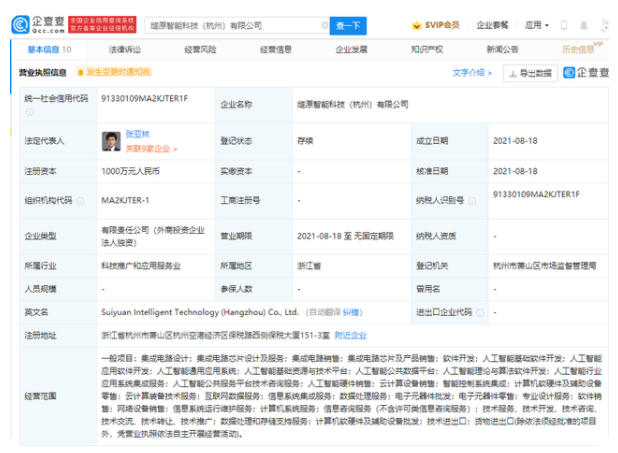 企查查APP顯示,8月18日,燧原智能科技(杭州)有限公司成立,法定代表人為張亞林,注冊資本1000萬元人民幣,經(jīng)營范圍包含:集成電路設(shè)計;集成電路芯片設(shè)計及服務(wù);集成電路銷售;集成電路芯片及產(chǎn)品銷售等。企查查股權(quán)穿透顯示,該公司由騰訊關(guān)聯(lián)公司上海燧原科技有限公司100%控股。