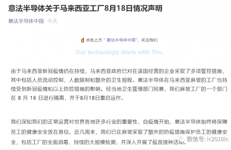意法半導(dǎo)體官方公眾號發(fā)布聲明表示,其馬來西亞廠已重啟運作,聲明信息如下: