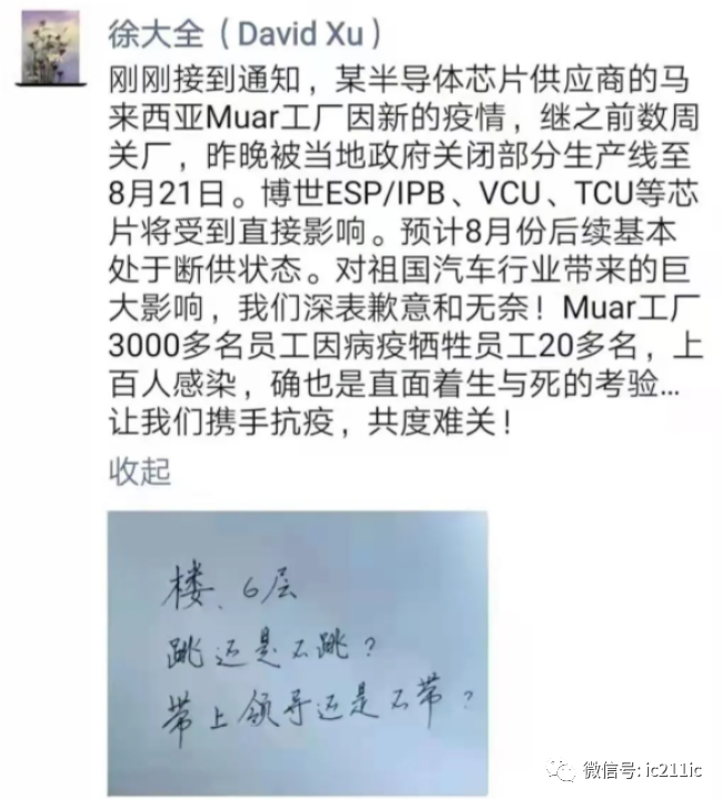 據(jù)悉,昨日有消息稱,博世(中國)副總裁徐大全博士通過朋友圈爆料ST供應(yīng)商的馬來西亞Muar工廠因新的疫情,繼之前數(shù)周關(guān)廠,再度被當(dāng)?shù)卣箨P(guān)閉部分生產(chǎn)線至8月21日。