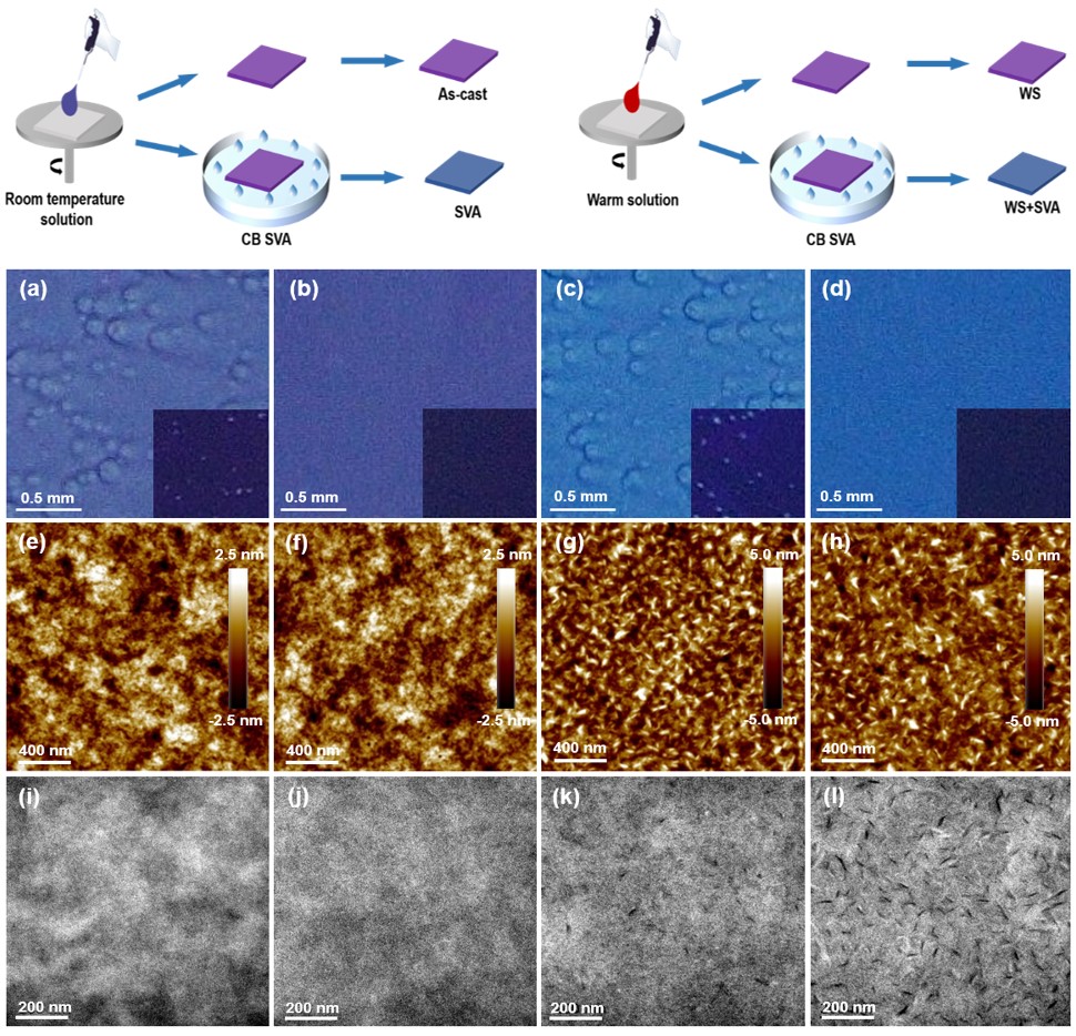 在本項研究中,研究者采用了熱溶液(warm solution, WS)和溶劑熏蒸退火(solvent-vapor annealing,SVA)雙管齊下的策略來調(diào)控小分子有源層的形貌。其中WS不僅能夠提升給受體材料(B1和BTP-eC9)的溶解度,而且在成膜過程中能夠加速溶劑揮發(fā),減少成膜時間,使有源層中分子分布更加均勻,形成光滑無孔的混合薄膜;SVA可調(diào)控成膜后的分子動力學,延長分子自組裝時間。通過控制SVA時間可優(yōu)化有源層中的相分離和分子排布。通過WS+SVA的協(xié)同作用,有源層形貌得到較大改善,提升了器件的光子俘獲、激子解離、載流子傳輸和收集,從而使其獲得15.68%的效率,這是當時二元小分子OSCs的最高效率值。