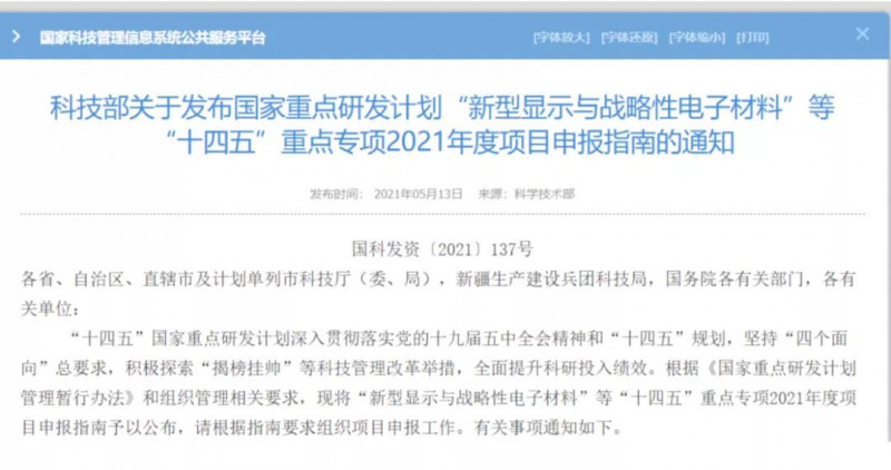 ※2021年5月13日,國家重點(diǎn)研發(fā)計(jì)劃啟動實(shí)施“新型顯示與戰(zhàn)略性電子材料”重點(diǎn)專項(xiàng)。本重點(diǎn)專項(xiàng)總體目標(biāo)是:面向國家產(chǎn)業(yè)安全、戰(zhàn)略產(chǎn)品及重大工程建設(shè)需求,以滿足關(guān)鍵領(lǐng)域重點(diǎn)電子材料急需為目標(biāo),突破新型顯示產(chǎn)業(yè)應(yīng)用關(guān)鍵核心技術(shù),打通創(chuàng)新鏈,突破戰(zhàn)略性電子材料制備與應(yīng)用各環(huán)節(jié)的共性關(guān)鍵技術(shù),保障我國信息、能源、交通、高端裝備等領(lǐng)域核心電子材料和器件的自主供給。