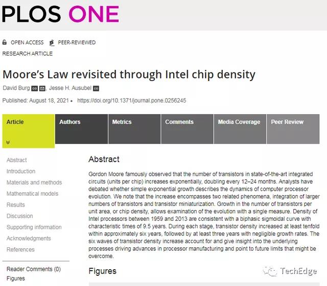 有關(guān)這項(xiàng)研究的詳情,已經(jīng)發(fā)表在近日出版的《PLOS One》 期刊上,原標(biāo)題為《Moore’s Law revisited through Intel chip density》。