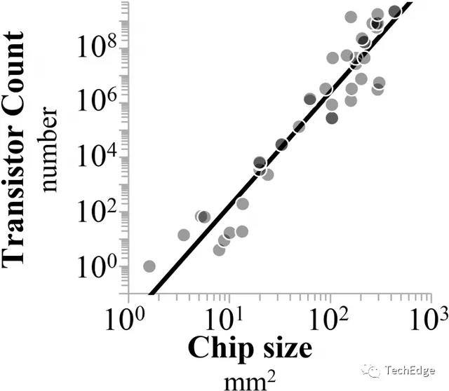 研究配圖 - 2:最先進(jìn)處理器尺寸與晶體管數(shù)量的冪律關(guān)系