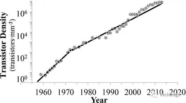 研究配圖 - 3:最先進(jìn)集成電路密度的逐年發(fā)展(單位:m㎡)
