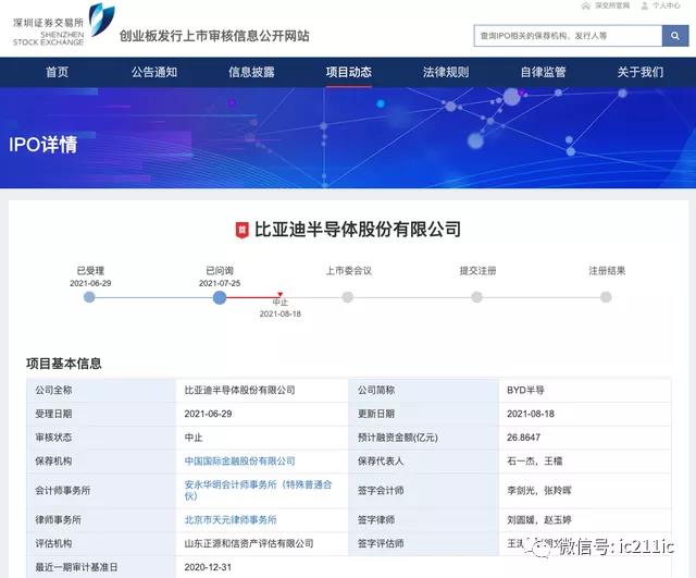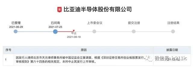 據(jù)創(chuàng)業(yè)板發(fā)行上市審核信息公開網(wǎng)站顯示,深交所已于 8 月 18 日中止比亞迪半導體股份有限公司發(fā)行上市審核。 本次中止的原因則是發(fā)行人律師北京市天元律師事務所被中國證監(jiān)會立案調查。