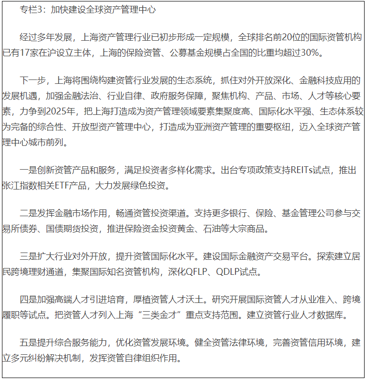 17.提升全球資產(chǎn)管理能力。豐富資產(chǎn)管理行業(yè)主體,集聚銀行理財(cái)、保險(xiǎn)資產(chǎn)管理、金融資產(chǎn)投資等機(jī)構(gòu)及其專業(yè)子公司,支持證券、基金、信托、期貨等機(jī)構(gòu)及其專業(yè)子公司落戶。重點(diǎn)發(fā)展基金登記、估值核算、基金評(píng)價(jià)、貨幣經(jīng)紀(jì)、咨詢資訊等服務(wù)機(jī)構(gòu),研究設(shè)立專業(yè)托管機(jī)構(gòu)。加強(qiáng)資產(chǎn)管理產(chǎn)品和服務(wù)創(chuàng)新,加大權(quán)益類產(chǎn)品發(fā)行力度,豐富固定收益產(chǎn)品種類。在中證張江自主創(chuàng)新50指數(shù)基礎(chǔ)上推出ETF產(chǎn)品。加強(qiáng)管理人中管理人(MOM)、基金中基金(FOF)等產(chǎn)品研發(fā)。支持?jǐn)U大基金投資顧問試點(diǎn)資格,推動(dòng)資產(chǎn)管理機(jī)構(gòu)參與基本養(yǎng)老保險(xiǎn)基金、企業(yè)年金、職業(yè)年金管理。深化私募基金跨境投資試點(diǎn),推動(dòng)參與合格境外有限合伙人(QFLP)試點(diǎn)的外資機(jī)構(gòu)管理境內(nèi)人民幣基金,鼓勵(lì)符合條件的內(nèi)資機(jī)構(gòu)參與QFLP試點(diǎn),支持境外知名資產(chǎn)管理機(jī)構(gòu)和符合條件的境內(nèi)機(jī)構(gòu)申請(qǐng)合格境內(nèi)有限合伙人(QDLP)試點(diǎn)資質(zhì)。