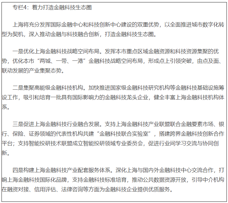 24.營造金融科技發(fā)展環(huán)境。推動(dòng)數(shù)據(jù)資源共享開放,在充分保障數(shù)據(jù)安全的前提下,推動(dòng)跨領(lǐng)域、跨行業(yè)的數(shù)據(jù)融合與協(xié)同創(chuàng)新,依法有序豐富金融科技數(shù)據(jù)資源。推動(dòng)金融科技生態(tài)系統(tǒng)構(gòu)建,鼓勵(lì)金融機(jī)構(gòu)和科技企業(yè)聯(lián)合設(shè)立金融科技領(lǐng)域的創(chuàng)新研發(fā)中心、重點(diǎn)實(shí)驗(yàn)室、聯(lián)合實(shí)驗(yàn)室、孵化器等,打造集群式、蜂巢式的金融科技創(chuàng)新生態(tài)體系。舉辦全球金融科技峰會(huì),提升上海金融科技中心影響力。培養(yǎng)引進(jìn)金融科技高端人才,加大對(duì)金融科技人才的支持力度。