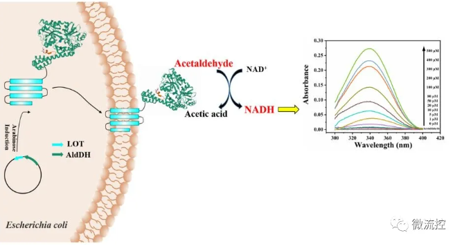 記者了解到,基于乙醛脫氫酶(AldDH)細(xì)菌表面展示系統(tǒng),楊建明團(tuán)隊(duì)開發(fā)出一種乙醛光學(xué)微生物傳感器,其檢測原理是AldDH催化乙醛生成乙酸,同時(shí)輔酶NAD+還原為NADH,產(chǎn)物NADH在340nm處有特征吸收峰,因此,在一定范圍內(nèi),隨著乙醛濃度的增加,340nm處的吸光度逐漸升高。