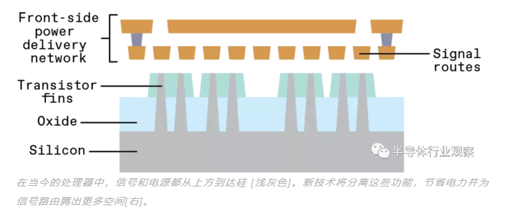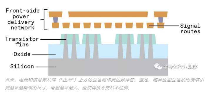 然后,您可以看到,為電路供電的金屬——供電網(wǎng)絡(luò) (power delivery network:PDN)——位于晶體管的頂部。我們將此稱為前端供電。您還可以看到,電力網(wǎng)絡(luò)不可避免地與傳輸信號(hào)的電線網(wǎng)絡(luò)競(jìng)爭(zhēng)空間,因?yàn)樗鼈児蚕硗唤M銅線資源。