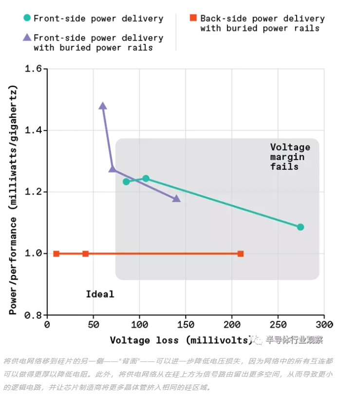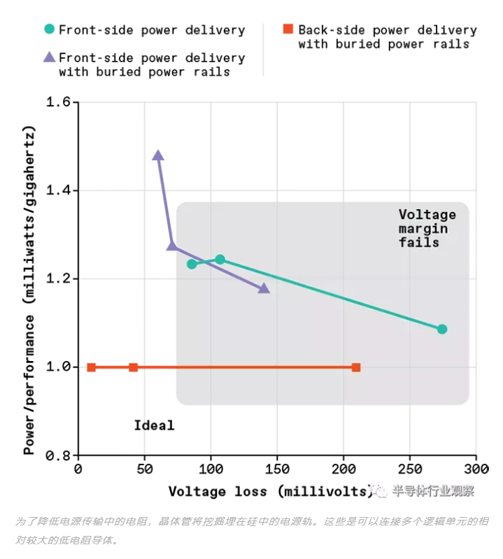 不幸的是,似乎僅埋葬本地電源軌是不夠的。您仍然必須從芯片的頂部向下向這些軌道輸送電源,這將降低效率和一些電壓損失。
