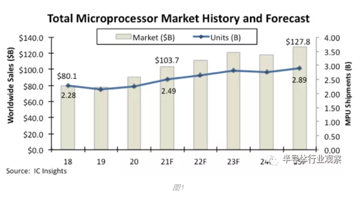 IC Insights 在最近發(fā)布的《2021 年麥克林報(bào)告》的年中更新中表示,現(xiàn)在預(yù)計(jì)MPU 銷(xiāo)售額將在 2021 年增長(zhǎng) 14%,這將使微處理器市場(chǎng)總額達(dá)到創(chuàng)紀(jì)錄的 1037 億美元,而此前預(yù)計(jì)的增長(zhǎng)為 9%。