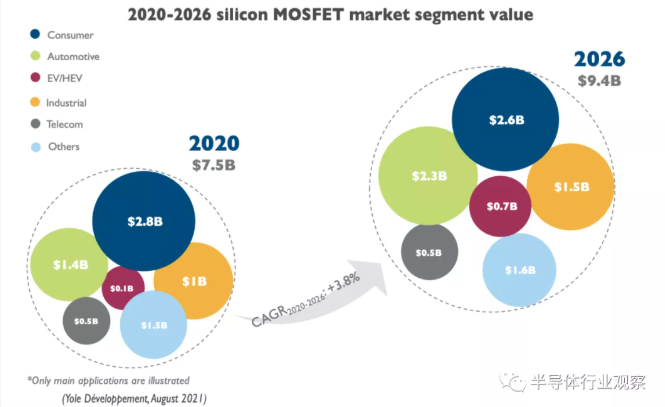 據(jù)Yole Développement (Yole)電力電子與化合物半導(dǎo)體技術(shù)與市場(chǎng)分析師 Ana Villamor所說,硅 MOSFET 是非常廣泛的中低功率應(yīng)用中的關(guān)鍵組件。他進(jìn)一步指出,在2020年,硅MOSFET市場(chǎng)價(jià)值75億美元。而Yole預(yù)計(jì), 2020 年至 2026 年間,硅 MOSFET的復(fù)合年增長(zhǎng)率為 3.8%,就意味著到 2026 年,MOSFET 市場(chǎng)規(guī)模將達(dá)到 94 億美元。其中大部分收入來自消費(fèi)者和汽車市場(chǎng)。