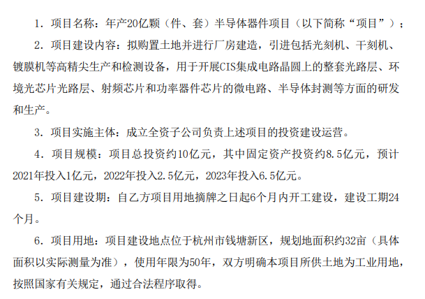 公司擬成立子公司,使用自有或自籌資金等方式購置土地并進(jìn)行廠房建造,引進(jìn)包括光 刻機(jī)、干刻機(jī)、鍍膜機(jī)等高精尖生產(chǎn)和檢測(cè)設(shè)備,重點(diǎn)開展CIS集成電路晶圓上的 整套光路層、環(huán)境光芯片光路層、射頻芯片和功率器件芯片的微電路、半導(dǎo)體封測(cè)等方面的研發(fā)和生產(chǎn),從而促進(jìn)公司可持續(xù)、高質(zhì)量發(fā)展。項(xiàng)目總投資約10億元,其中固定資產(chǎn)投資約8.5億元。