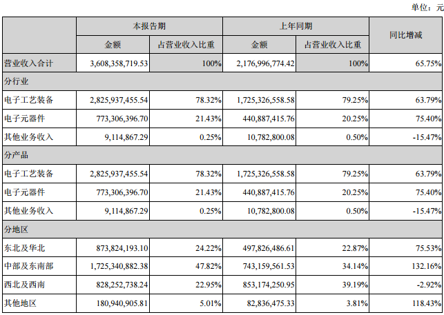 據(jù)北方華創(chuàng)介紹,2021年上半年,公司電子工藝裝備和電子元器件業(yè)務(wù)發(fā)展態(tài)勢良好。半導(dǎo)體裝備業(yè)務(wù)方面,芯片市場整體需求旺盛,集成電路邏輯器件、先進存儲、先進封裝等產(chǎn)線新建及擴建需求上升;在“碳達峰、碳中和”目標(biāo)指引下,光伏行業(yè)投資增長;5G應(yīng)用、汽車電子等需求拉動了第三代半導(dǎo)體產(chǎn)線投資快速增長,疊加新型顯示等泛半導(dǎo)體產(chǎn)線投資需求,為公司半導(dǎo)體裝備業(yè)務(wù)提供了成長空間。公司刻蝕機、PVD、CVD、立式爐、清洗機、ALD等設(shè)備新產(chǎn)品市場導(dǎo)入節(jié)奏加快,產(chǎn)品工藝覆蓋率及客戶滲透率進一步提高,在集成電路領(lǐng)域主流生產(chǎn)線實現(xiàn)批量銷售,第三代半導(dǎo)體、新型顯示、光伏設(shè)備產(chǎn)品線進一步拓寬,出貨量實現(xiàn)較快增長。公司真空熱處理設(shè)備在市場拓展方面取得良好進展。電子元器件方面,受益于下游市場的需求放大,公司電子元器件業(yè)務(wù)同比實現(xiàn)較快增長。