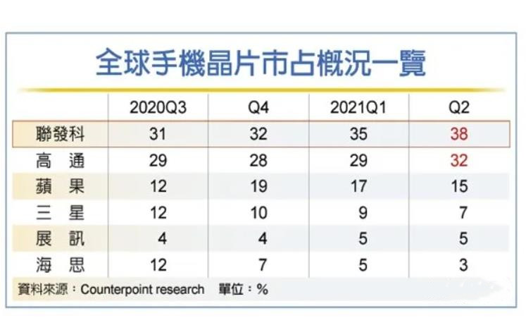 按照數(shù)據(jù)顯示,聯(lián)發(fā)科以38%的市場(chǎng)份額,再次超過高通,成為全球第一。而高通的份額為32%,較聯(lián)發(fā)科還是有6個(gè)百分點(diǎn)的差距,排名第二。