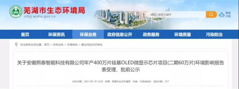 近日,安徽蕪湖市生態(tài)環(huán)境局發(fā)布了“關(guān)于安徽熙泰智能科技有限公司年產(chǎn)400萬片硅基OLED微顯示芯片項目(二期60萬片)環(huán)境影響報告表受理、批前公示”。