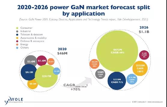2020-2026,這一市場(chǎng)的主力應(yīng)用方向預(yù)計(jì)都將是消費(fèi)應(yīng)用:2026年消費(fèi)應(yīng)用會(huì)占到整個(gè)GaN功率市場(chǎng)的大約61%——2020年這部分市場(chǎng)規(guī)模是2870萬美元,2026年則將大幅擴(kuò)張至6.72億美元,CAGR 69%。從OPPO較早為其手機(jī)配備65W功率的氮化鎵充電器開始,去年諸多手機(jī)OEM廠商和配件供應(yīng)商都開始提供氮化鎵快充解決方案。