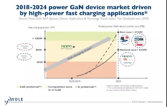 Yole在報(bào)告中提到去年功率GaN市場(chǎng)容量是翻倍的,這主要得益于快充應(yīng)用的滲透,而且這種市場(chǎng)趨勢(shì)會(huì)在配件市場(chǎng)上延續(xù)——尤其是在蘋果、小米、三星等廠商對(duì)其旗艦手機(jī)產(chǎn)品不再采用隨機(jī)附贈(zèng)的充電器解決方案以后。