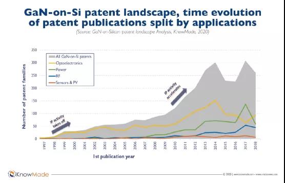 這張圖是相關(guān)GaN-on-Si專利公布數(shù)量這些年的發(fā)展趨勢(shì)——不過方向涵蓋了光電、功率、射頻、傳感器等,其中綠色的是我們本次關(guān)注的功率器件部分。其整體大趨勢(shì)走勢(shì)都在往上。
