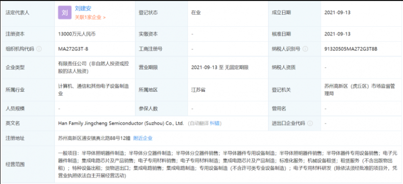 9月13日,大族精誠半導(dǎo)體(蘇州)有限公司成立,法定代表人為劉建安,注冊(cè)資本1.3億元人民幣,經(jīng)營范圍包含:半導(dǎo)體器件專用設(shè)備制造;集成電路芯片及產(chǎn)品制造;電子專用材料研發(fā)等。據(jù)企查查股權(quán)穿透顯示,該公司由大族激光100%控股。