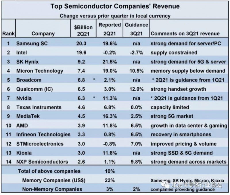 根據(jù)世界半導(dǎo)體貿(mào)易統(tǒng)計(jì)協(xié)會(WSTS) ,半導(dǎo)體市場在2021年第二季度展現(xiàn)了強(qiáng)勁增長,相比2021年第一季上升了8.3%,并且同比上漲了29%。大多數(shù)主要半導(dǎo)體公司在這一季度經(jīng)歷了顯著的收入增長。存儲公司表現(xiàn)尤其強(qiáng)勁,三星、SK海力士、美光和鎧俠的2021年第一季度對比2021第二季度營收(以當(dāng)?shù)刎泿庞?jì)算)分別增長19.6%、21.5%、19.0%和11.8%。三星在2021年第二季度超越了英特爾,重新位列半導(dǎo)體供應(yīng)鏈排名第一。以美元計(jì)算,存儲公司的表現(xiàn)甚至更好,總共增長了22%。非存儲類公司的結(jié)果喜憂參半。有三家公司的季度環(huán)比增長率達(dá)到了兩位數(shù):聯(lián)發(fā)科16.3%,AMD 11.8%,英偉達(dá)11.3%。然而英特爾下跌了0.2%,意法半導(dǎo)體下跌了0.8%。從2021年第一季度到第二季度,非存儲類公司總體增長了3%。