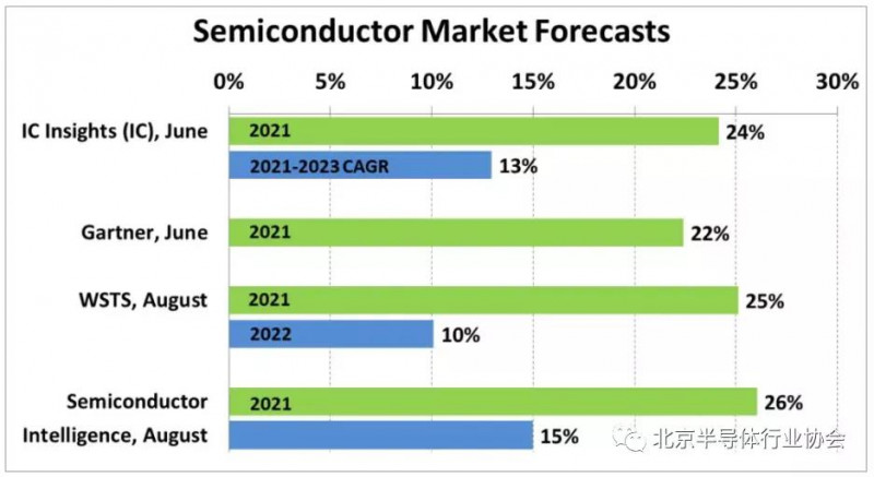 2021年上半年的強(qiáng)勁勢頭(較2020年上半年增長24%)將推動半導(dǎo)體市場在2021年全年大幅增長。WSTS剛剛用2021年第二季度的最終數(shù)據(jù)更新了其2021年春季預(yù)測,現(xiàn)在正在預(yù)測2021年將增長25%。今年6月,IC Insights預(yù)計(jì)2021年的增長率為24%,Gartner則是預(yù)計(jì)22%。我們來自半導(dǎo)體情報(bào)(Semiconductor Intelligence)的最新預(yù)測是26%。