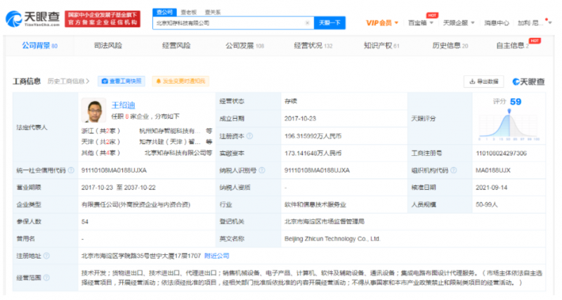 該公司成立于2017年10月,法定代表人為王紹迪,經(jīng)營范圍包括技術(shù)開發(fā);銷售電子產(chǎn)品、計算機(jī)、通訊設(shè)備;集成電路布圖設(shè)計代理服務(wù)等。