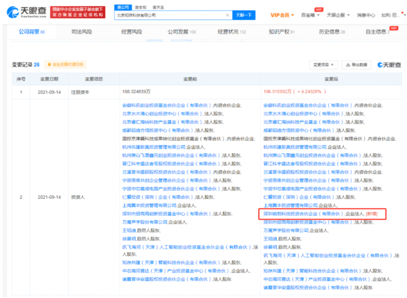 天眼查App顯示,近日,北京知存科技有限公司發(fā)生工商變更,新增股東深圳哈勃科技投資合伙企業(yè)(有限合伙),同時企業(yè)注冊資本增至約196.32萬人民幣。
