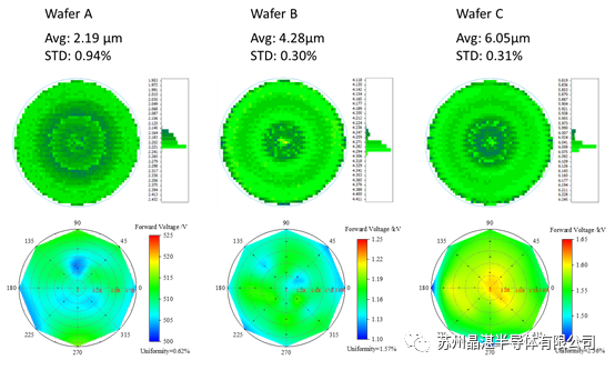 圖1:晶湛半導(dǎo)體300mm GaN-on-Si HEMT外延片系列(200V,650V,1200V擊穿電壓應(yīng)用)厚度均勻性分布圖和垂直擊穿電壓分布圖(漏電流=1?A/mm2@ RT)