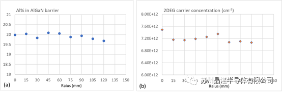 圖3:晶湛半導(dǎo)體300mm AlGaN/GaN HEMT外延片中勢壘層Al組分含量分布和2DEG濃度分布