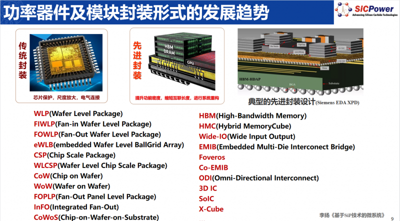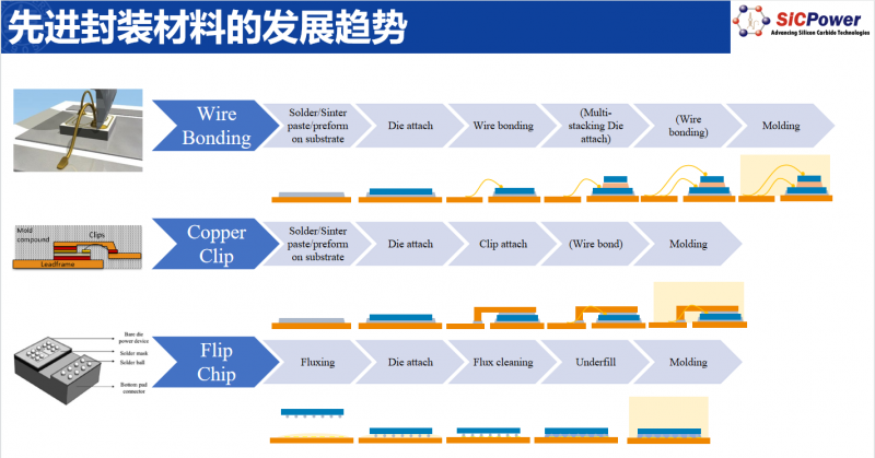 會上,復(fù)旦大學(xué)青年研究員樊嘉杰博士帶來了“SiC功率器件先進(jìn)封裝材料及可靠性優(yōu)化設(shè)計”的主題報告,報告指出隨著電子封裝技術(shù)向微型化、高密度、集成化、高可靠方向發(fā)展,芯片級封裝、系統(tǒng)級封裝、系統(tǒng)級芯片、三維立體封裝將陸續(xù)在碳化硅(SiC)功率模塊封裝中被采用。