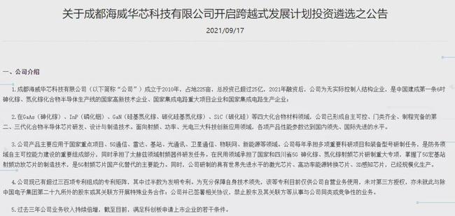 近日,成都海威華芯科技有限公司(以下簡稱“海威華芯”)發(fā)布“開啟跨越式發(fā)展計劃投資遴選之公告”。