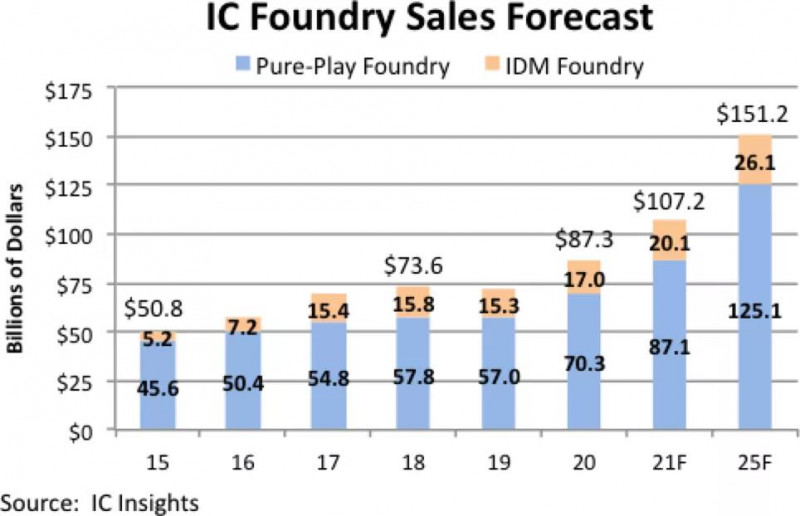 預(yù)計(jì)今年純代工市場(chǎng)將大幅增長(zhǎng) 24%,達(dá)到 871 億美元,超過(guò)2020 年23% 的增長(zhǎng)。預(yù)計(jì)到 2025 年,純代工市場(chǎng)將增長(zhǎng)至 1251 億美元,導(dǎo)致 5 年(2020-2025 年)復(fù)合年增長(zhǎng)率為 12.2%,占 2025 年代工總銷(xiāo)售額的 82.7%,而 2021 年為 81.2%。臺(tái)積電、聯(lián)電和幾家專(zhuān)業(yè)代工廠預(yù)計(jì)今年將實(shí)現(xiàn)平穩(wěn)的銷(xiāo)售增長(zhǎng)。這些供應(yīng)商也在大力投資新產(chǎn)能,以支持預(yù)測(cè)期內(nèi)對(duì)其服務(wù)的預(yù)期需求。