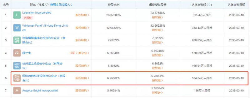 天眼查信息顯示,美芯晟工商信息于9月29日發(fā)生變更,注冊資本由2468.09萬元增至2632.63萬元,增幅6.67%,同時新增股東深圳哈勃。目前深圳哈勃為美芯晟第六大股東,持股6.25%。