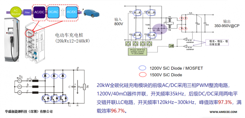 同時,目前碳化硅已經(jīng)在充電模塊中開始應(yīng)用。20kW全碳化硅充電模塊的前級AC/DC采用三相PWM整流電路,1200V/40mΩ器件并聯(lián),開關(guān)頻率35kHz,后級DC/DC采用兩電平交錯并聯(lián)LLC電路,開關(guān)頻率120kHz~300kHz,峰值效率97.3%,滿載效率96.7%。并且,充電樁低噪音已成趨勢。傳統(tǒng)直流充電樁在使用時,會產(chǎn)生很大的噪聲,對周圍環(huán)境造成了噪聲污染,如果能夠?qū)υ胍粼催M行消音處理,能夠提高環(huán)境品質(zhì),消除噪聲污染。他表示,可以通過熱仿真和流體仿真優(yōu)化風(fēng)道設(shè)計,通過風(fēng)機變頻控制及優(yōu)化控制算法,通過使用降噪材料和吸音材料和通過定向降噪方法來實現(xiàn)充電樁低噪音。