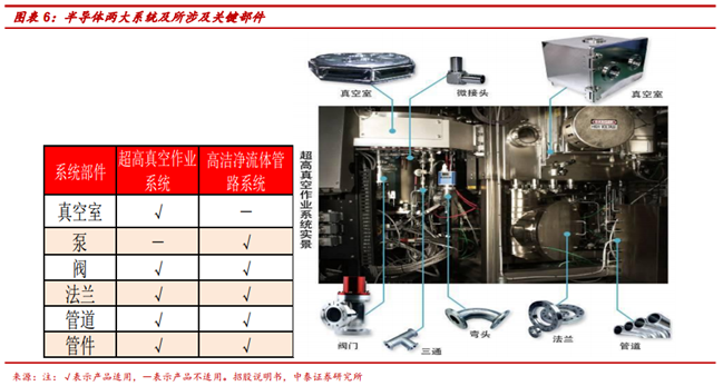 日前,據(jù)中泰證券張欣在研報中表示,半導體制程污染控制包括高潔凈氣體管路、高純真空作業(yè)系統(tǒng),關鍵組件包括真空室(負壓)、泵、閥、法蘭、管道和管件等。