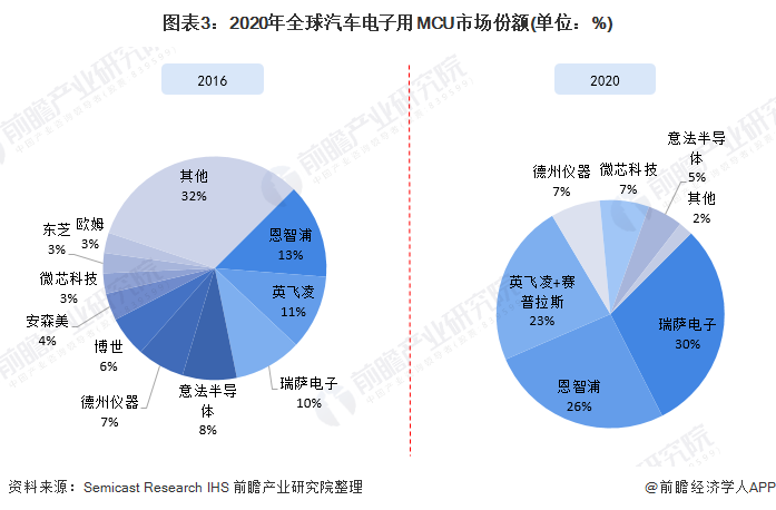 根據(jù)IHS數(shù)據(jù),2020年,全球汽車電子用MCU龍頭企業(yè)為瑞薩電子、恩智浦、英飛凌等,其中瑞薩電子市場份額大幅提升,達到30%。