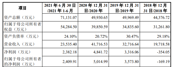 受益于智能終端、新能源、光伏發(fā)電等下游行業(yè)的快速發(fā)展,2018年至2021年上半年,德邦科技實現(xiàn)營業(yè)收入分別為1.97億元、3.27億元、4.17億元、2.35億元,對應(yīng)的凈利潤分別為-354.05萬元、3316.06萬元、4841.72萬元、2382.18萬元,實現(xiàn)快速增長。