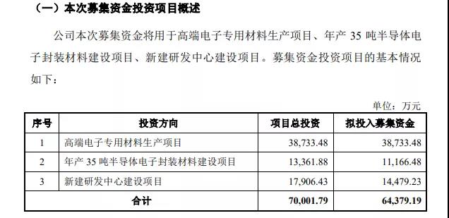 德邦科技本次擬募集資金6.44億元,用于高端電子專用材料生產(chǎn)項(xiàng)目、年產(chǎn)35噸半導(dǎo)體電子封裝材料建設(shè)項(xiàng)目、新建研發(fā)中心建設(shè)項(xiàng)目,分別擬投入募集資金3.87億元、1.12億元、1.45億元。