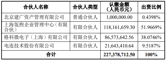 據(jù)披露,合伙企業(yè)認(rèn)繳出資總額為2.27億元,其中上海瓴煦擬出資1.18億元,認(rèn)繳出資比例51.97%,格科微上海擬出資8657.36萬(wàn)元,認(rèn)繳出資比例為38.07%,電連技術(shù)擬出資2164.34萬(wàn)元,認(rèn)繳出資比例9.52%,建廣資產(chǎn)擬出資100萬(wàn)元,認(rèn)繳出資比例為0.44%。