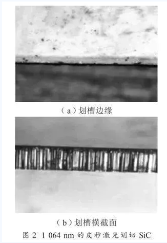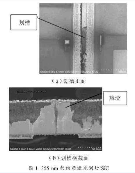 目前,激光劃片設備采用工業(yè)激光器,波長主要有 1 064 nm、532 nm、355 nm 三種,脈寬為納秒、皮秒和飛秒級。理論上,激光波長越短、脈寬越短,加工熱效應越小,有利于微細精密加工,但成本相對較高。355 nm 的紫外納秒激光器因其技術成熟、成本低、加工熱效應小,應用非常廣泛。近幾年 1 064 nm 的皮秒激光器技術發(fā)展迅速,應用到很多新領域,獲得了很好的效果。圖 1、圖 2 分別對 2 種激光器劃切 SiC 晶圓的效果進行了對比。