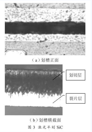 激光半劃適用于解理性較好的材料加工,激光劃切至一定深度,然后采用裂片方式,沿切割道產生縱向延伸的應力使芯片分離。這種加工方式效率高,無需貼膜去膜工序,加工成本低。但碳化硅晶圓的解理性差,不易裂片,裂開的一面容易崩邊,劃過的部分仍然存在熔渣粘連現象,如圖 3 所示。