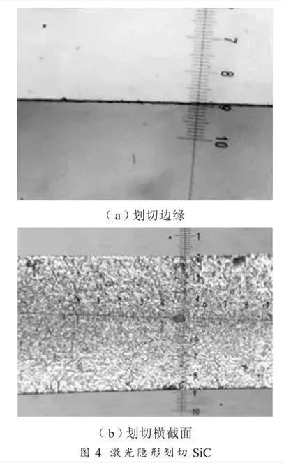 碳化硅材料解理性差,改質層的間隔不能太大。試驗采用 JHQ-611 全自動劃片機和 350 μm厚的 SiC 晶圓,劃切 22 層,劃切速度 500 mm/s,裂開后的斷面比較光滑,崩邊小,邊緣整齊,如圖4 所示。