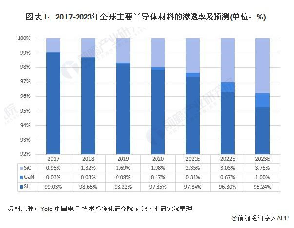 氮化鎵半導(dǎo)體能夠承受比硅半導(dǎo)體更強(qiáng)的電流和更高的電壓。這些優(yōu)勢(shì)導(dǎo)致了在下一代功率半導(dǎo)體器件中使用的氮化鎵的密集研發(fā),用于車(chē)輛和其他用途。但是從材料的滲透率來(lái)看,根據(jù)Yole及中國(guó)電子技術(shù)標(biāo)準(zhǔn)化研究院統(tǒng)計(jì)數(shù)據(jù),當(dāng)前半導(dǎo)體材料中,硅Si的滲透率仍然最高并占據(jù)絕對(duì)重要地位,2020年Si的滲透率約為97.85%,氮化鎵GaN的滲透率僅為0.17%,處于起步階段。但從未來(lái)發(fā)展趨勢(shì)來(lái)看,氮化鎵的滲透率將會(huì)持續(xù)上升。