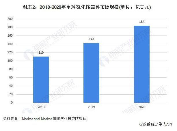 氮化鎵長(zhǎng)期以來(lái)生產(chǎn)LED和RF組件中使用,但目前正向著主流接受在越來(lái)越多的功率開(kāi)關(guān)和轉(zhuǎn)換應(yīng)用。在這里,基于GaN的IC可以滿(mǎn)足提高系統(tǒng)性能和效率、節(jié)省空間和在更高溫度下可靠運(yùn)行的需求。從全球氮化鎵(GaN)市場(chǎng)規(guī)模變化來(lái)看,根據(jù)Market and Market的數(shù)據(jù)統(tǒng)計(jì),2018-2020年全球氮化鎵器件市場(chǎng)規(guī)模逐漸擴(kuò)大,2020年全球氮化鎵器件市場(chǎng)規(guī)模達(dá)到了184億美元,同比增長(zhǎng)28.67%。