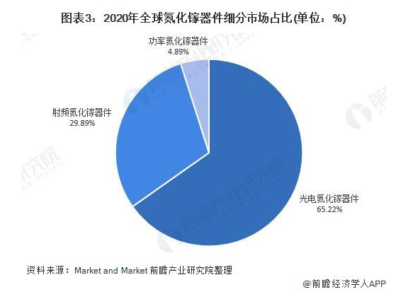 目前全球氮化鎵器件的主要分類(lèi)為光電氮化鎵器件、射頻氮化鎵器件和功率氮化鎵器件。從細(xì)分市場(chǎng)的角度來(lái)看,全球光電氮化鎵器件的市場(chǎng)應(yīng)用程度最高,占比達(dá)到65.22%;其次是射頻氮化鎵器件,市場(chǎng)占比約為29.89%;而功率氮化鎵器件的市場(chǎng)規(guī)模則占比最小,僅為4.89%。